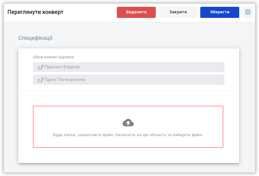 To send a new specification, do not clone the 'Signing of Specification' envelope. A new specification is created only by launching the 'Application for Sending a Specification to Epicenter envelope through the 'Create Document' button