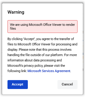 When the function is activated, a modal window will appear with a warning that we will use Microsoft Office Viewer to display files and a link to the privacy policy of this service.