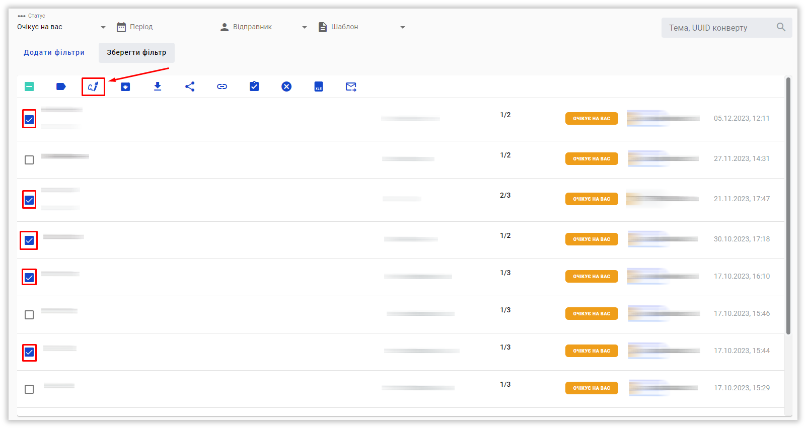 Select the envelopes you want to sign by ticking the boxes. Then, click the signature icon at the top.