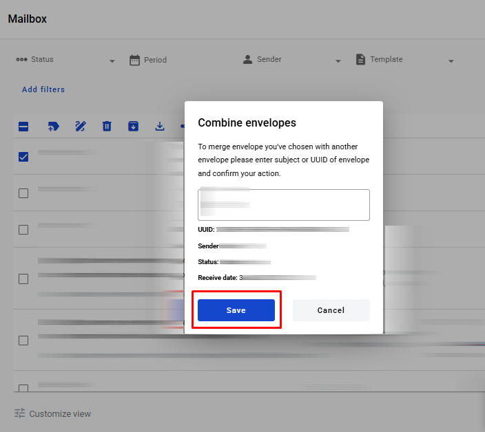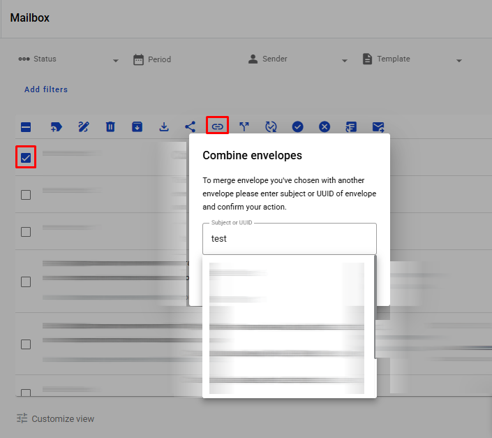 - If you want to add an envelope to an existing chain or combine envelopes that are not visible on the same page, select the envelope and click the 'Add to Chain' button. This will open the Merge Envelopes modal window, where you can search for the envelope you want to merge with by either subject or UUID