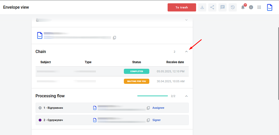 - In this section, you will find a complete list of the envelopes in the chain, sorted by the date of receipt in descending order. The current envelope will be highlighted in colour. By clicking on any of the other envelopes, you can open the selected envelope in a new tab