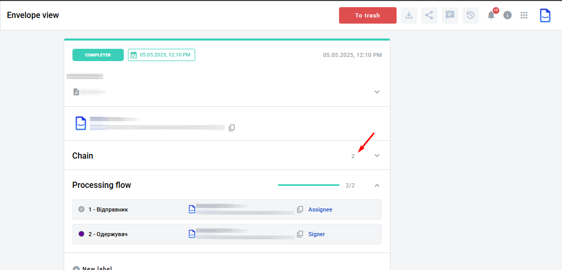 - When you open an envelope that is part of a chain, you will see a 'Chain' section in the header, displaying the total number of envelopes in that chain