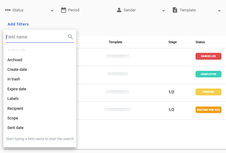 Furthermore, you can filter the displayed envelopes by selecting filters or envelope fields from the same menu.