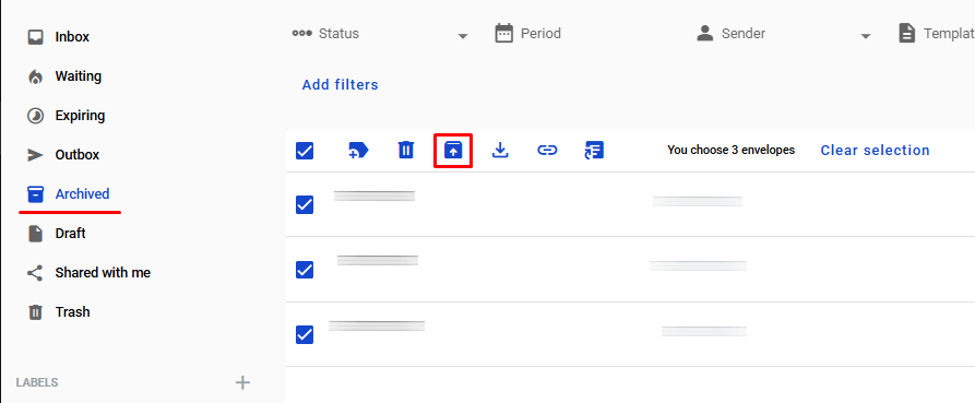If you need to access archived envelopes later, you can unarchive them by clicking the 'Unarchive' button in the Archived folder.