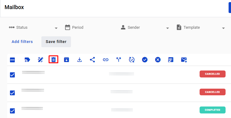 To delete envelopes, select them and click the 'Add to Trash' button.