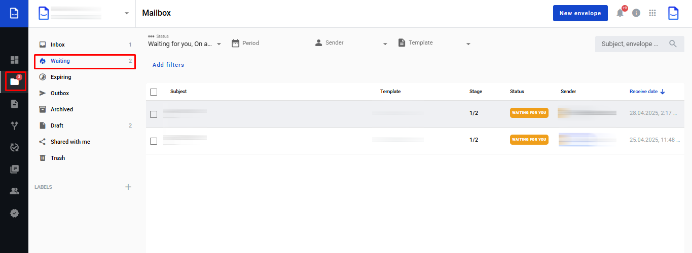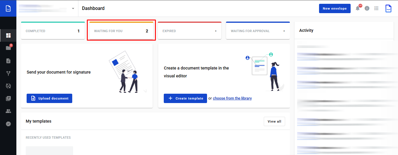 To locate the action you are currently performing during envelope processing, visit the 'Dashboard' tab, where you will find the status labelled 'Waiting for You':