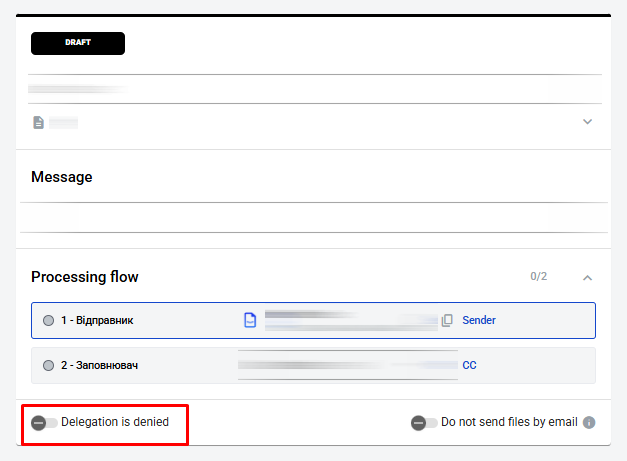 - It is also possible to restrict delegation on the draft page for each envelope individually if it was not done on the template level