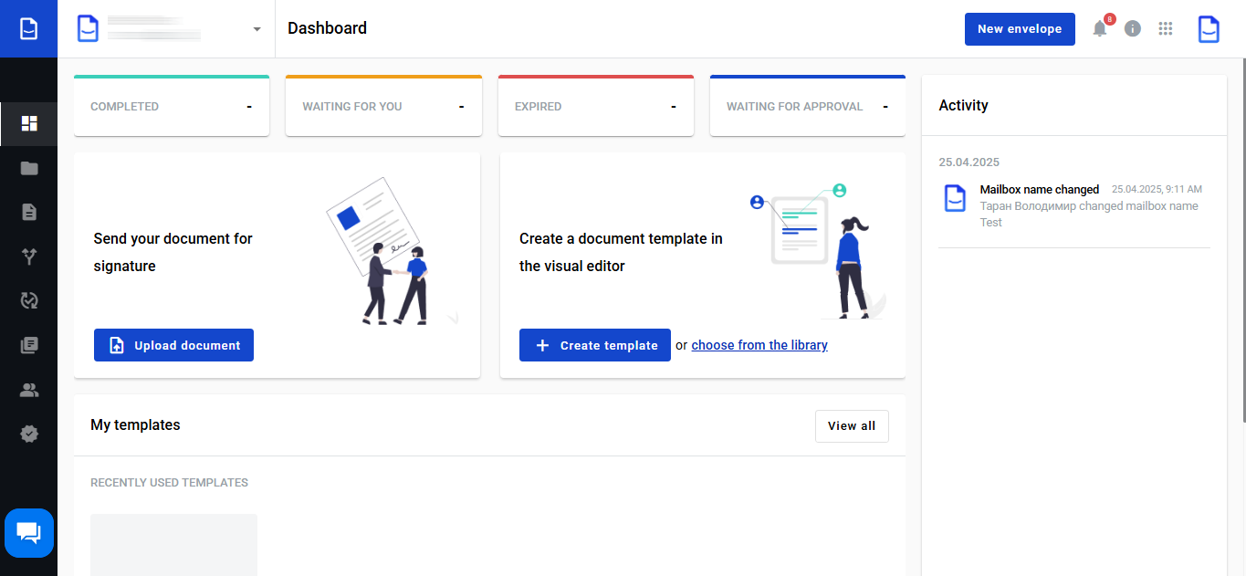The Recently Used Templates section on the dashboard allows you to create a new template, view a list of recently used templates, and access the complete template list: