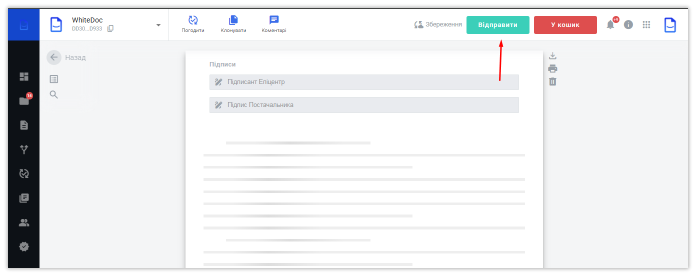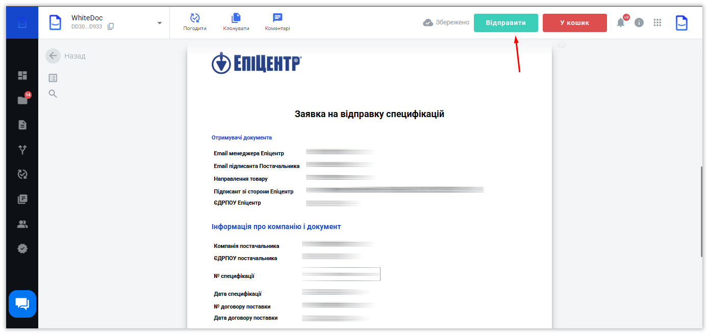 Для відправки нової специфікації не використовуйте клонування конверта "Підписання специфікації". Нова специфікація формується тільки через запуск конверта "Заявка на відправку специфікації Епіцентр" через кнопку "Створити документ"
