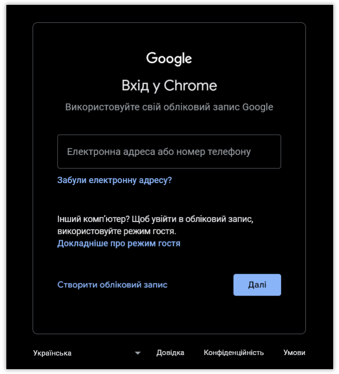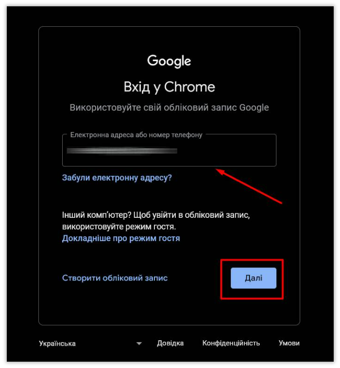 Після того як електронна адреса або номер телефону буде введено, натисніть кнопку “Далі”: