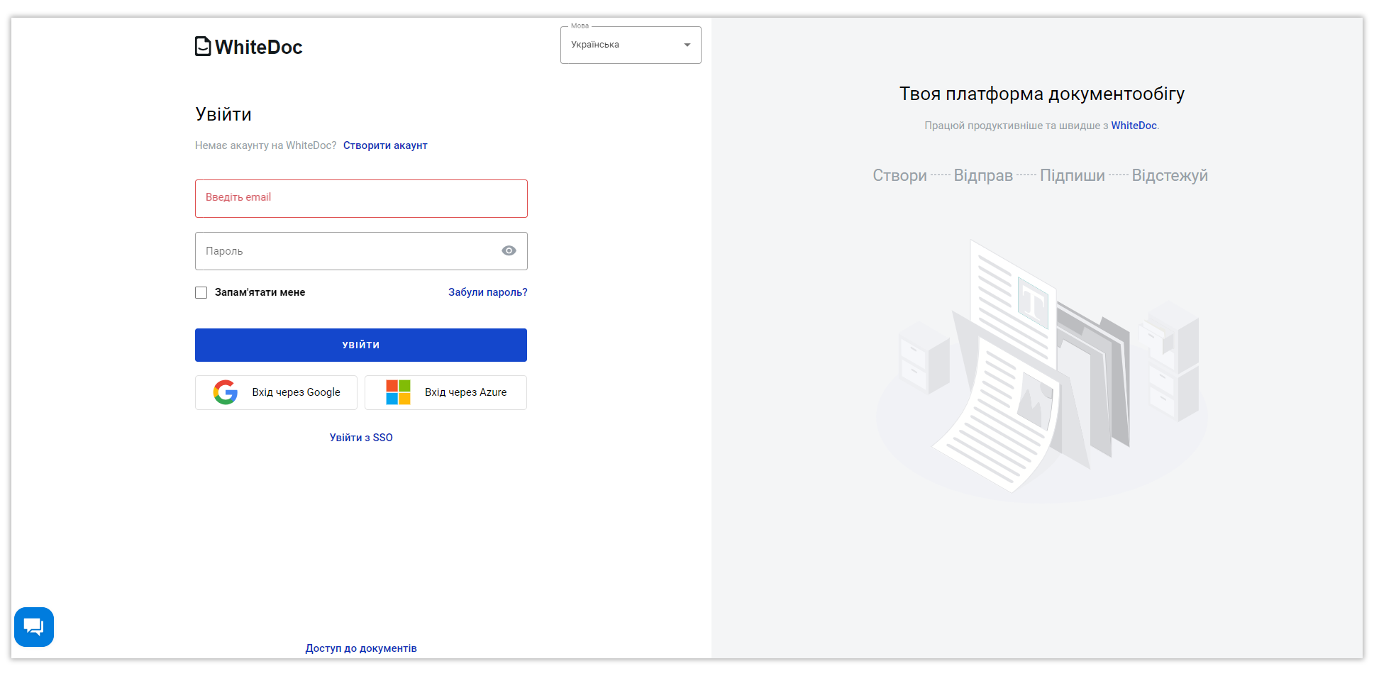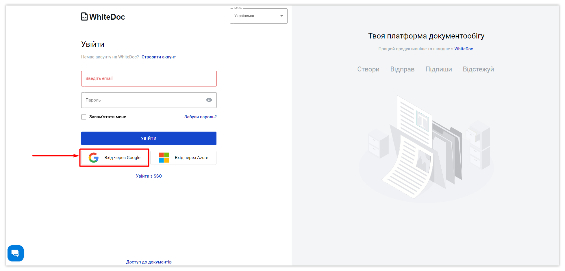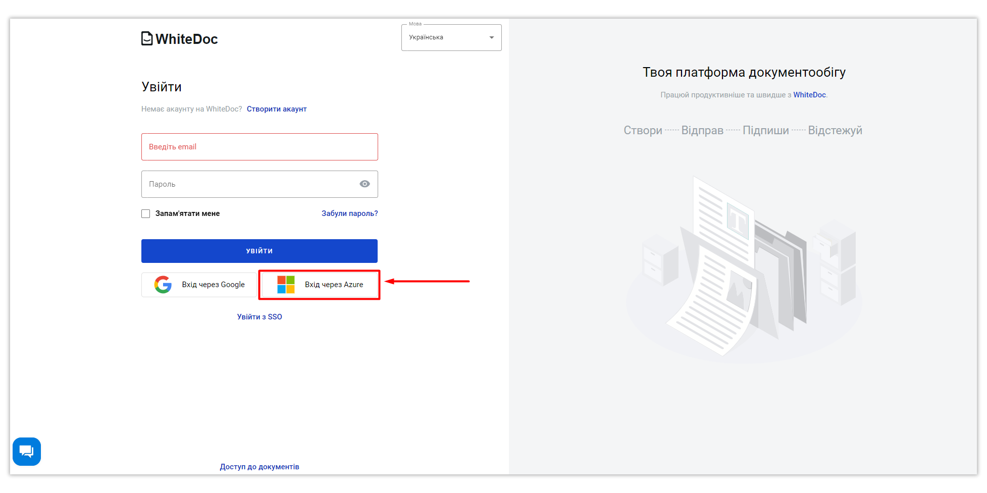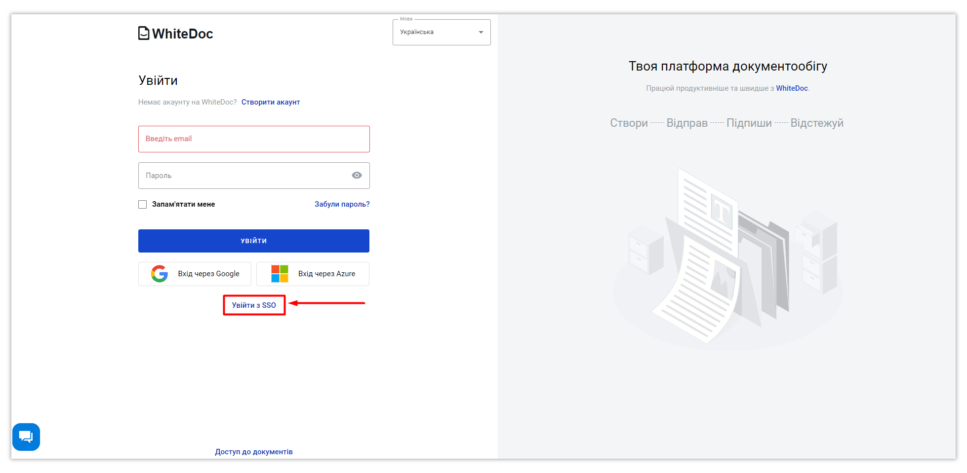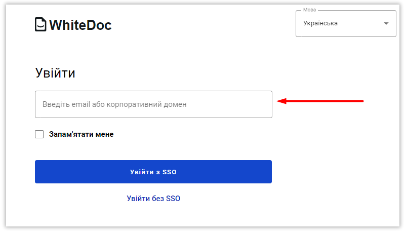 Для авторизації на платформі за допомогою SSO, відкрийте сторінку логіну WhiteDoc та натисніть кнопку "Увійти з SSO":