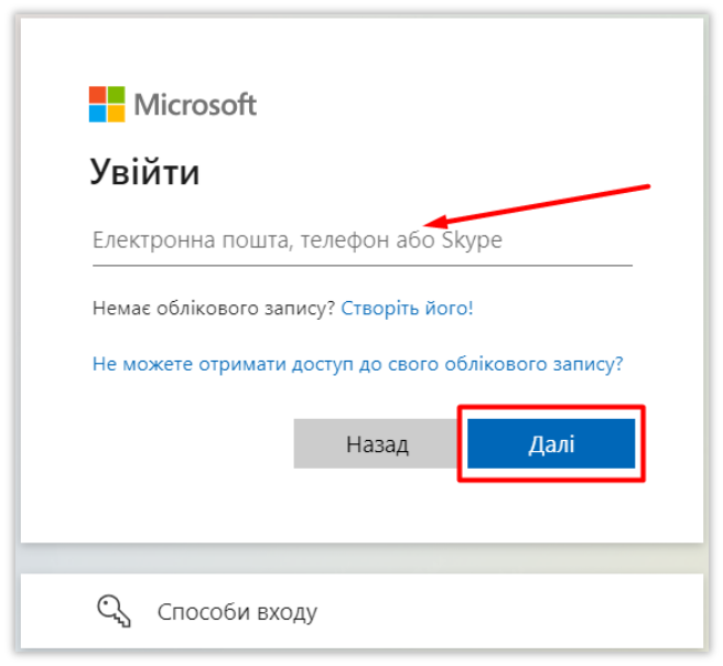 Введіть електронну адресу / номер телефону / Skype, залежно від того, що Ви використовували для реєстрації в обліковому записі Microsoft. Натисніть кнопку “Далі”: