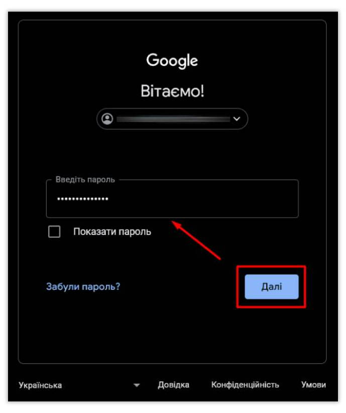 Введіть пароль від свого облікового запису і натисніть кнопку “Далі”: