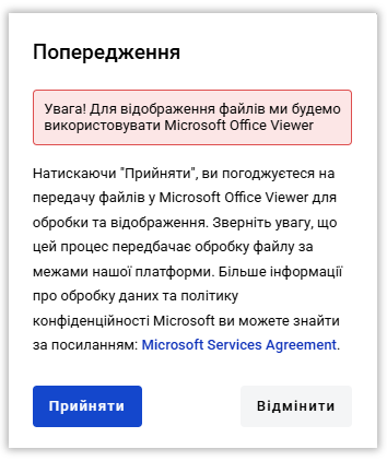 При активації функції з'явиться модальне вікно із попередженням, що для відображення файлів, ми будемо використовувати Microsoft Office Viewer та містити посилання на політику конфіденційності даного сервісу.