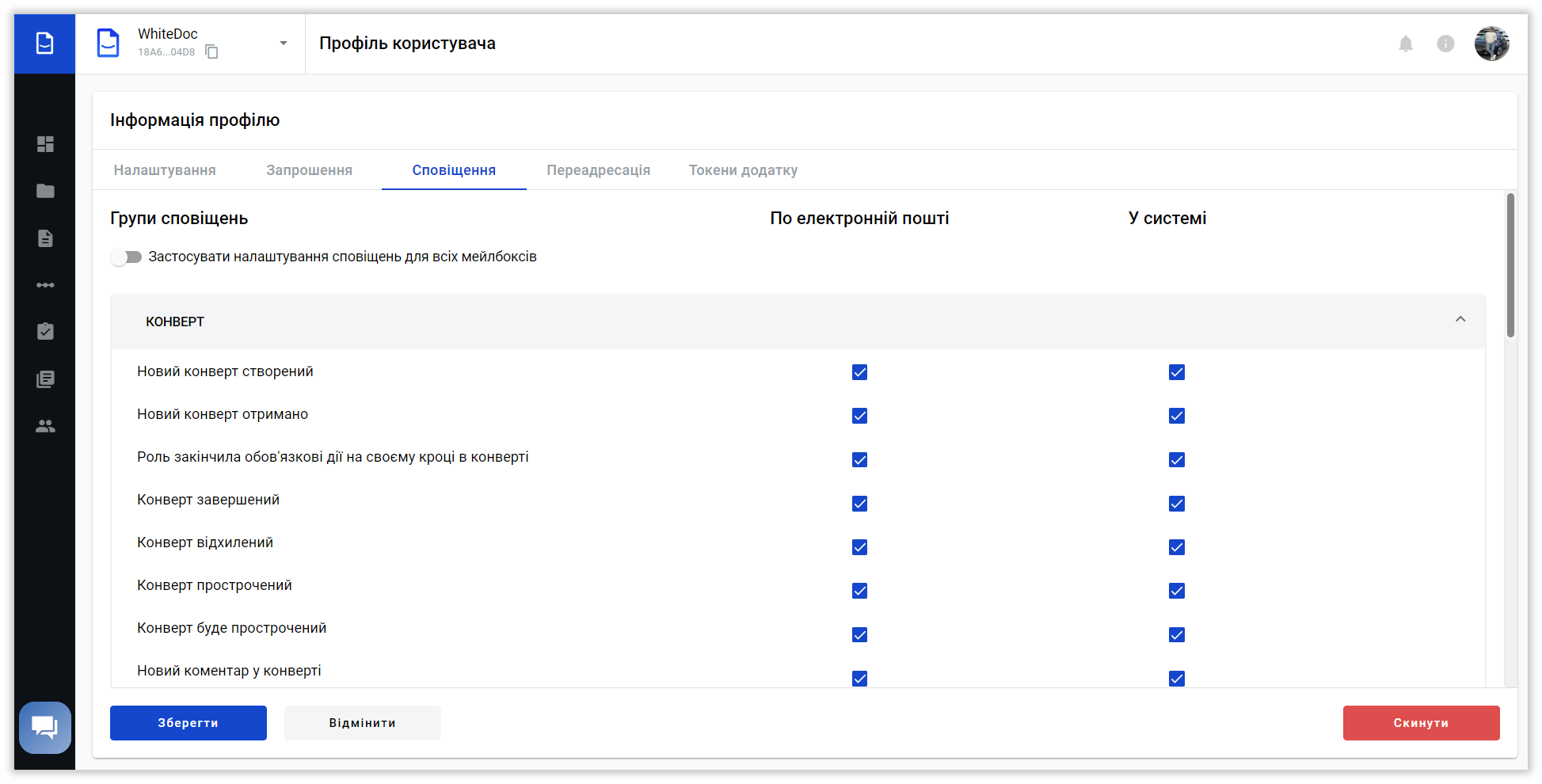 Наразі WhiteDoc має два типи сповіщень: на електронну пошту й у самому сервісі.