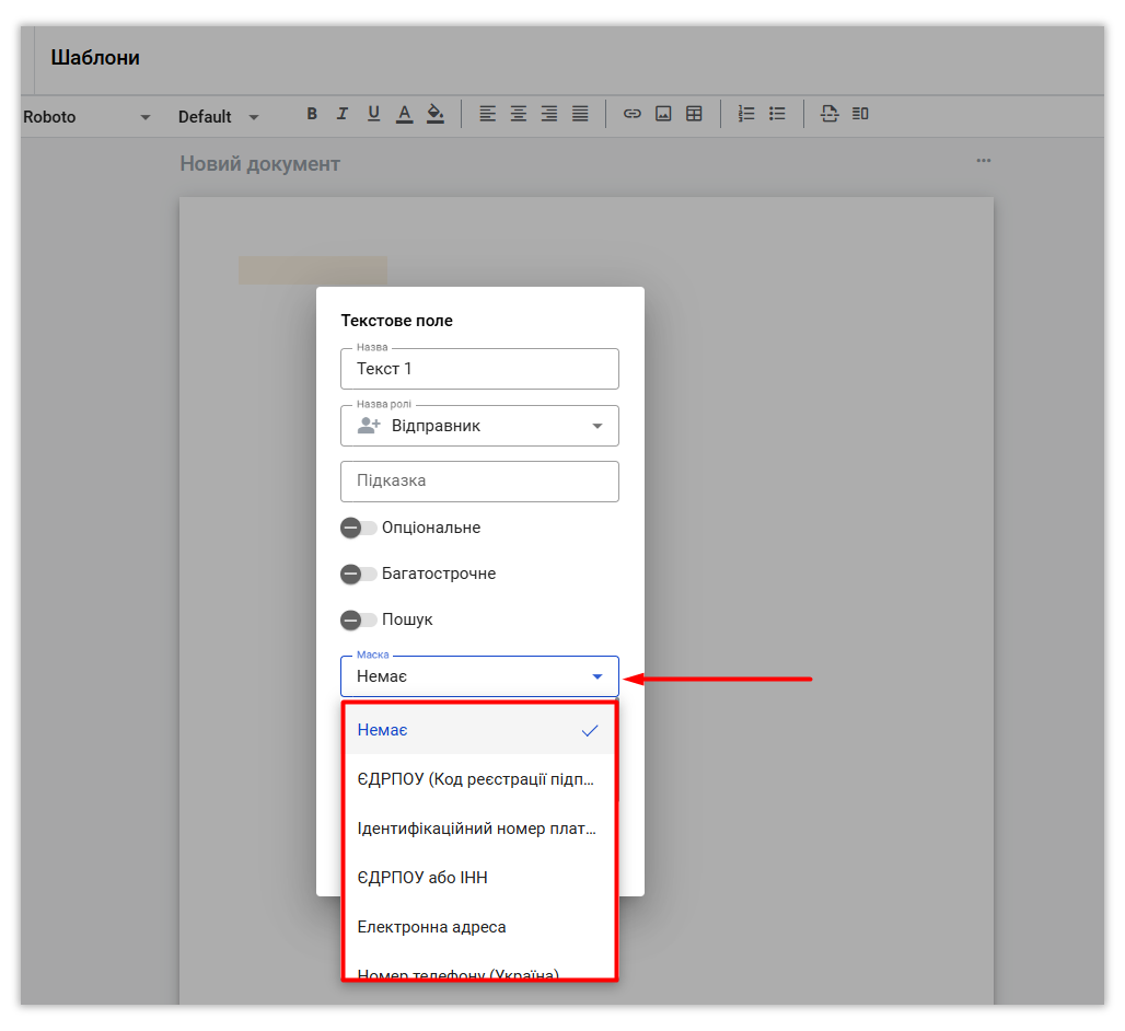 Реалізовано можливість встановлювати пресети валідації в шаблоні для текстового поля й використовувати валідацію під час заповнення таких полів в конверті. Додатково налаштовано пресети за замовчуванням