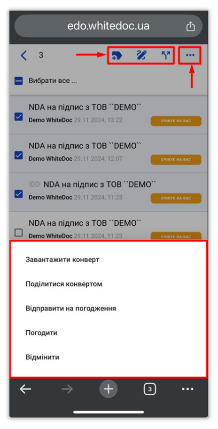 Розширено функціонал платформи, додано можливість виконувати масові дії з конвертами на мобільних та планшетах. Наразі доступні такі масові дії: делегувати, погодити, скасувати, поділитися, завантажити архів, додати/видалити ярлик, відправити на погодження