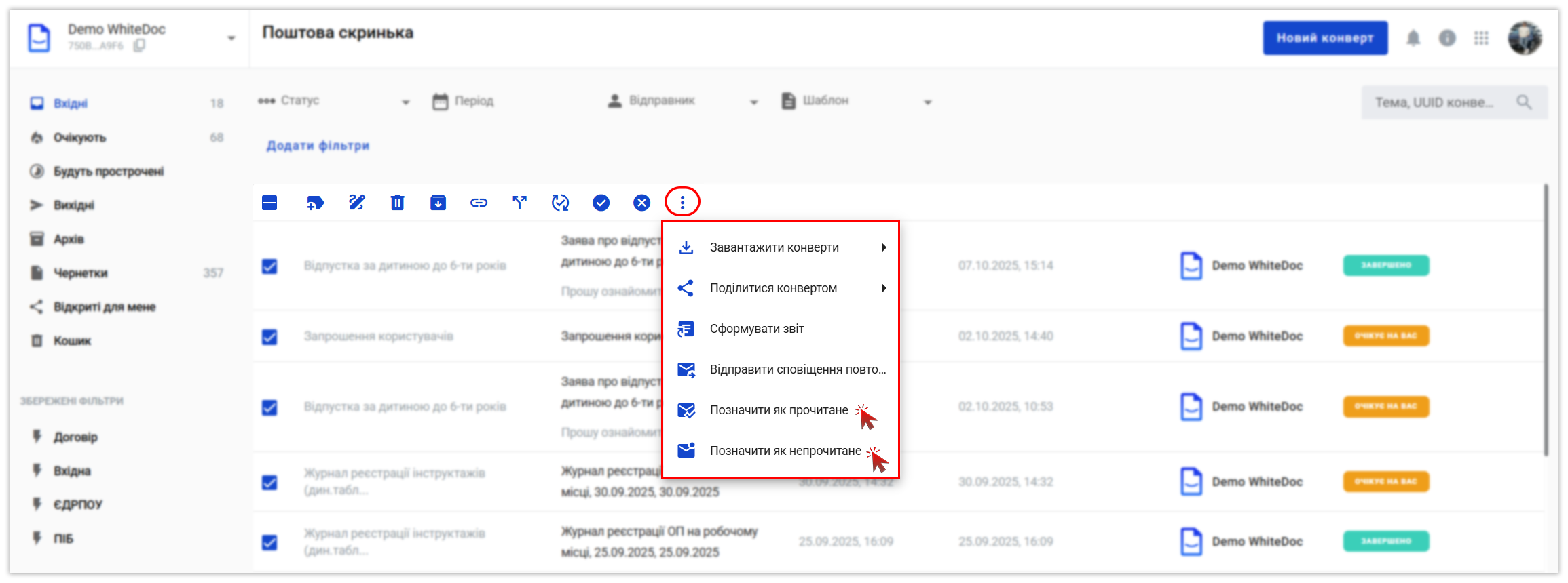 Впроваджено нову функціональність поштової скриньки: конверти в категоріях "Вхідні", "Очікують" та "Будуть прострочені" тепер можна позначити як прочитані або непрочитані. А частина масових дій були перенесена у додаткове меню, щоб спростити робочий процес