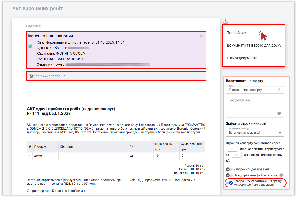 - Завантаження архіву конверта на будь-якому етапі обробки.