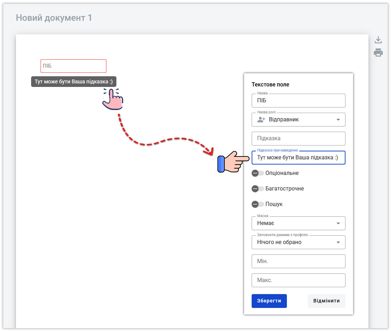 Реалізовано нову систему, де користувач може налаштувати власний текст підказок для полів при наведенні на них у конверті. Такі налаштування встановлюються в конструкторі шаблонів та допомагають заповнювачу не помилитись