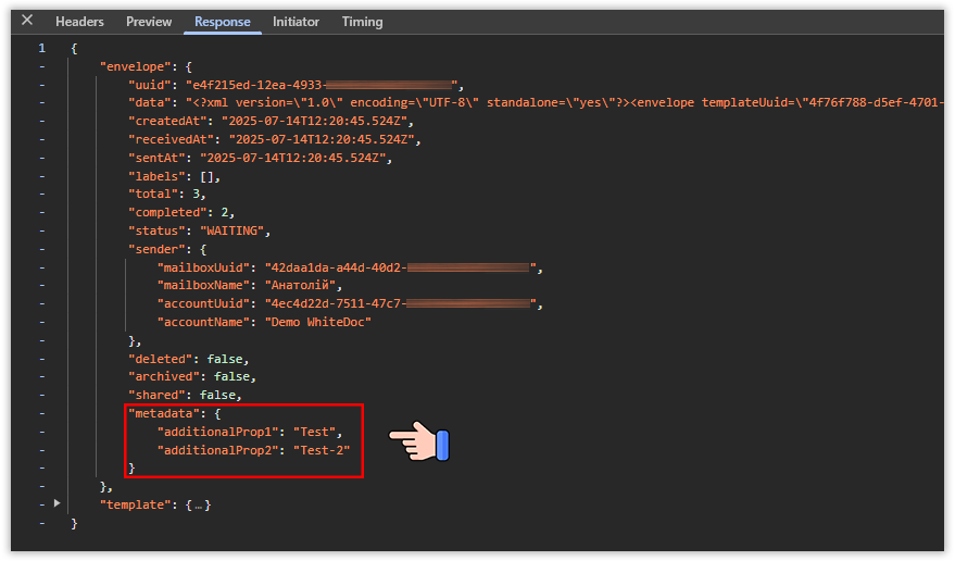 Реалізовано можливості додавання користувацьких (кастомних) метаданих для конверта на будь-якому його етапі процесу обробки. Керування метаданими доступно тільки через API для всіх учасників, або для будь-якої поштової скриньки з відповідними правами доступу. Використовуйте свої метадані інтегровано, в кілька кліків