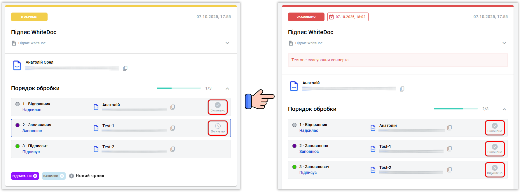 Покращено інтерфейс та користувацький досвід із чіткими індикаторами для завершених, активних та скасованих ролей. Тепер зручніше відстежувати, що відбувається з документом, а користувачі мають чітке розуміння, чи виконала та, чи інша роль свої обов'язкові дії в конверті, або ж яка з ролей його скасувала