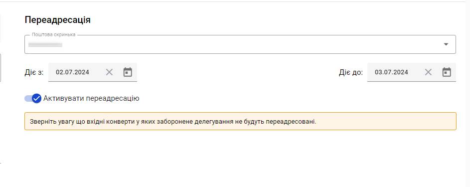 Цю секцію буде показано лише для поштових скриньок з дозволом на делегування. - У полі поштової скриньки знайдіть і виберіть потрібну поштову скриньку користувача, на якого потрібно делегувати конверт за назвою, UUID або псевдонімом (або введіть адресу електронної пошти). Після цього на неї буде делеговано усі вхідні конверти вашої поштової скриньки.