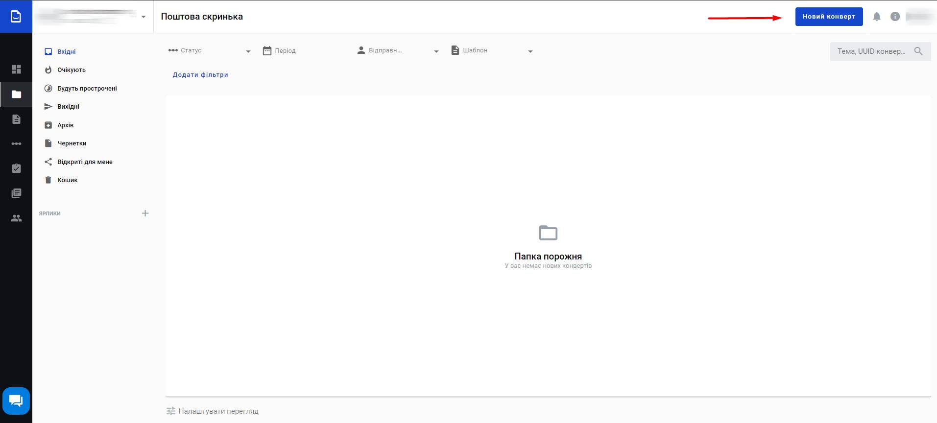 Ви можете переглядати та керувати своїми конвертами на сторінці Поштова скринька. Ви також можете створити новий конверт на цій сторінці, натиснувши кнопку "Новий конверт" біля іконки вашого профілю у верхньому правому куті.