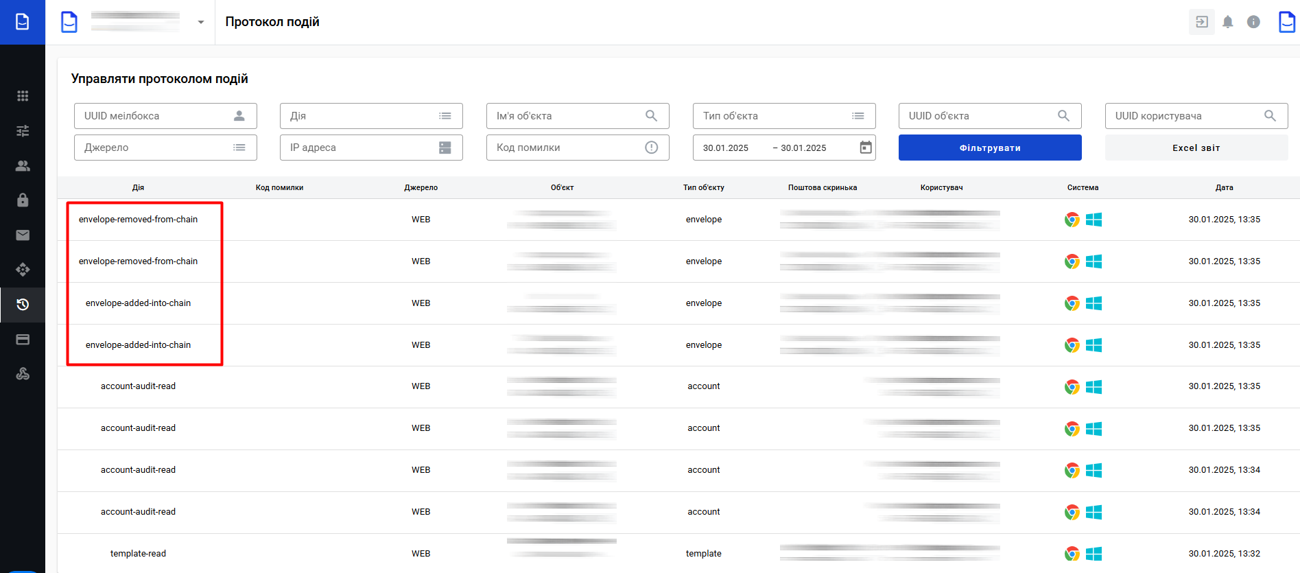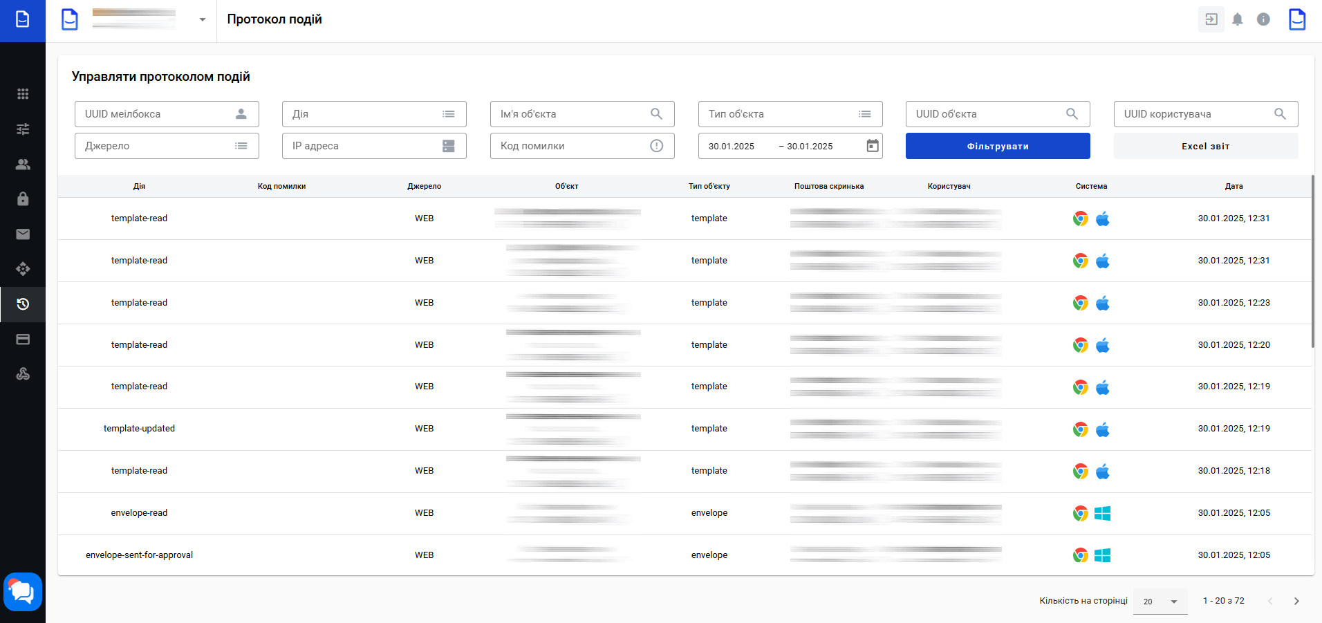 - Дія = Події, які відбулися з різними функціями акаунта, наприклад, створення словника, погодження або підписання конверта, створення нової поштової скриньки та інші, перераховані вище.
