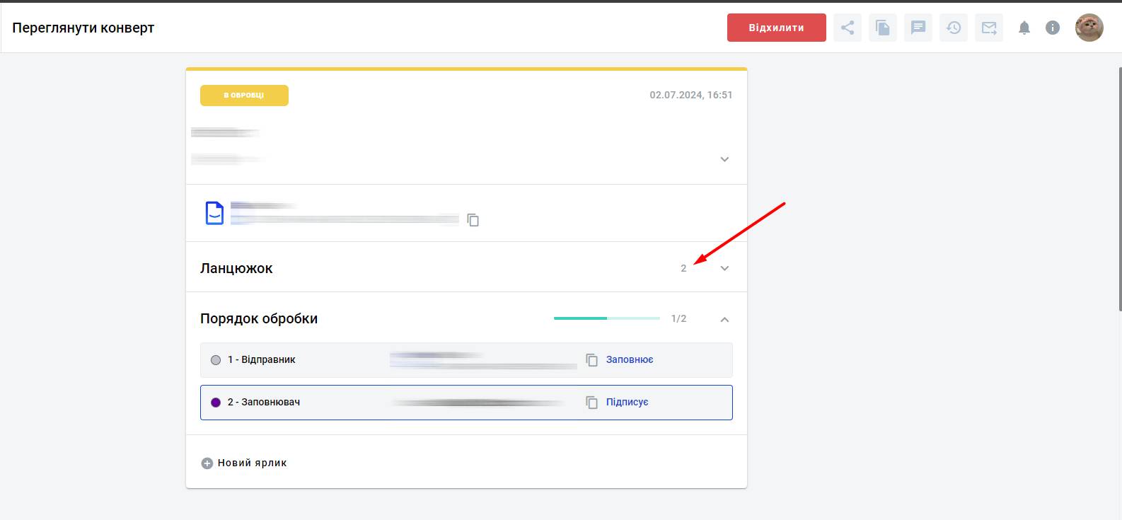 - Коли ви відкриваєте конверт з ланцюжком, у заголовку ви побачите розділ "Ланцюжок" з кількістю конвертів у цьому ланцюжку