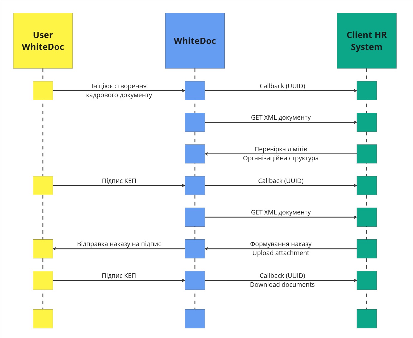 У цьому випадку HR система виступає master-системою, а WhiteDoc отримує дані співробітників через API.