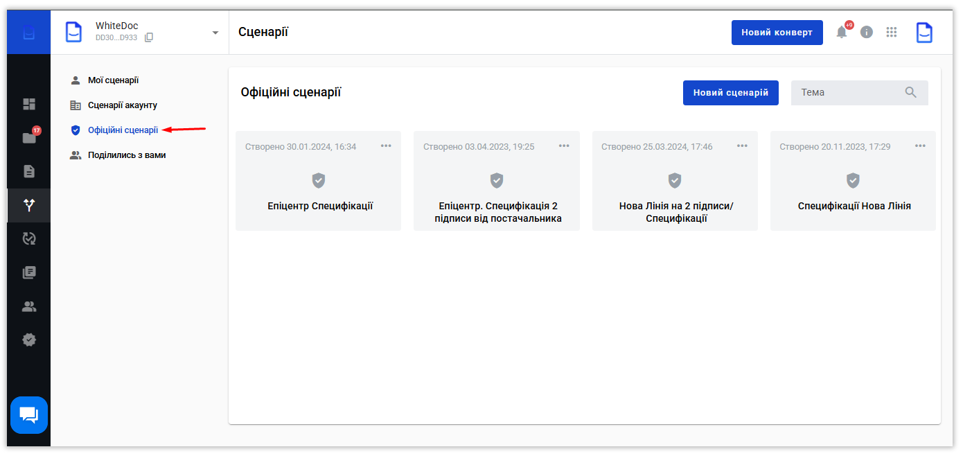 Обмін специфікаціями з мережею "Нова Лінія" відбувається виключно через функціонал "Сценарії".
