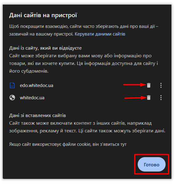 У наступному вікні натисніть на кошик навпроти "whitedoc.ua" та "edo.whitedoc.ua", тобто видаліть їх: