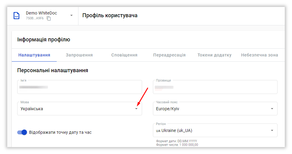 Сервіс WhiteDoc може відображатись кількома мовами, залежно від налаштувань, та має наступний перелік:
