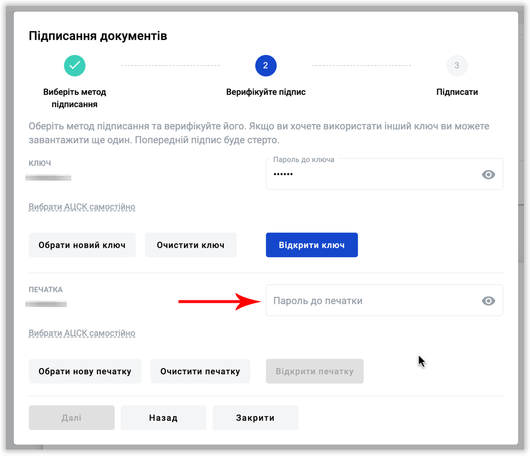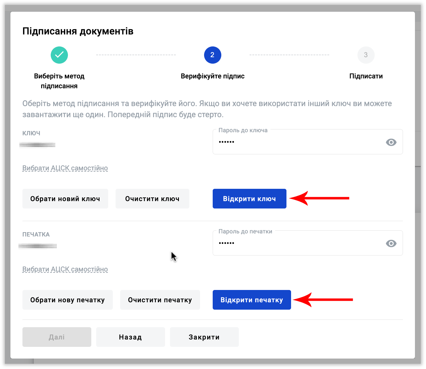 Після вводу пароля від підпису та печатки — натисніть кнопки "Відкрити ключ" та "Відкрити печатку":