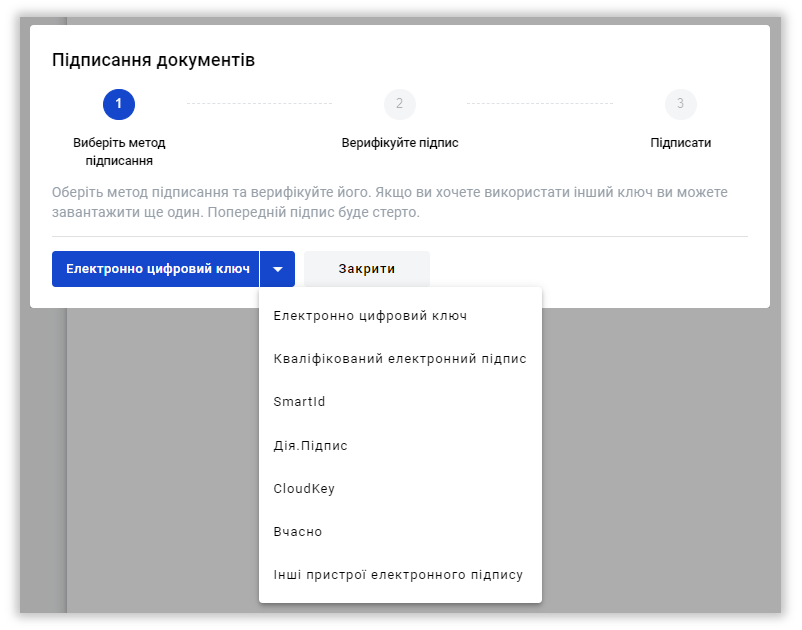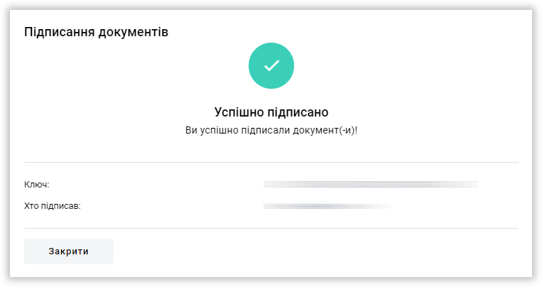 Ви отримаєте сповіщення про успішне підписання. Далі необхідно натиснути кнопку "Закрити":