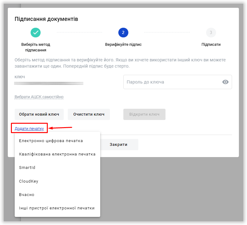 У наступному вікні одразу обираєте файл підпису. Система запропонує ввести пароль до ключа та трохи нижче "Додати печатку":