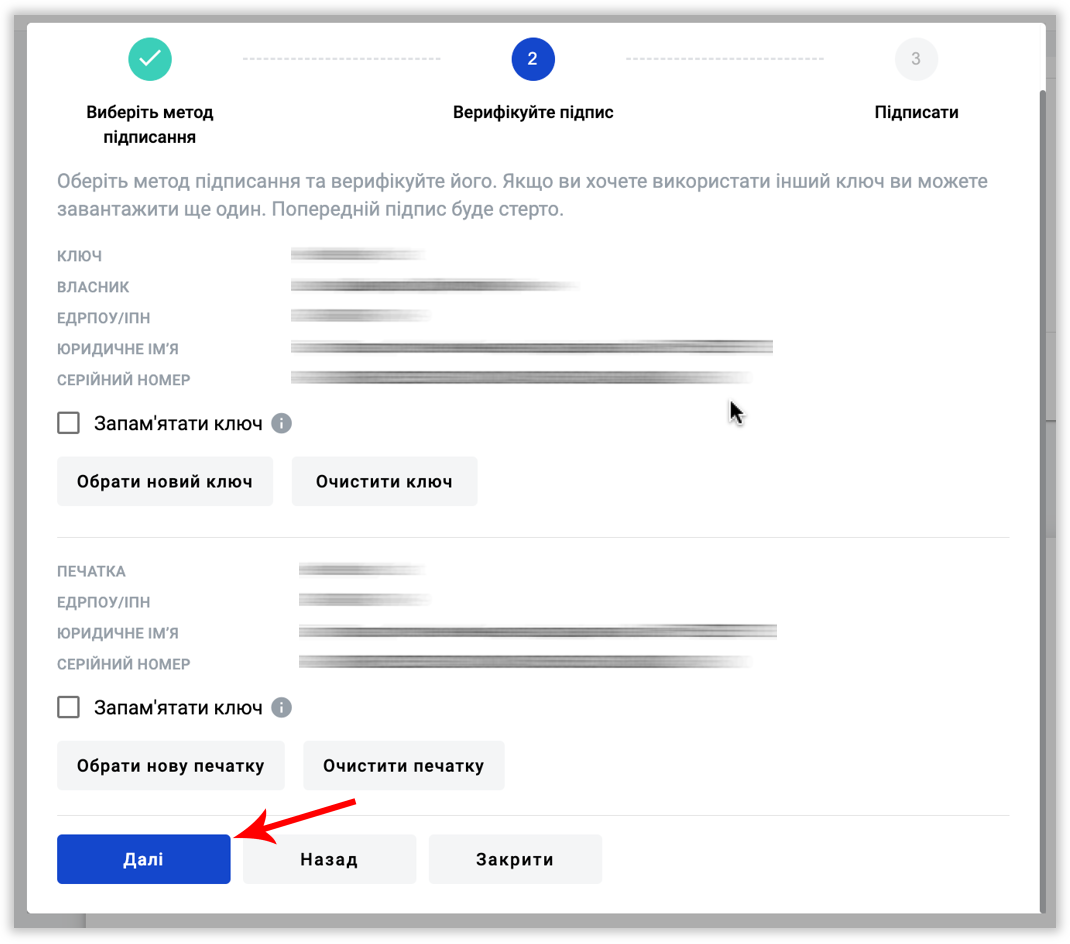 Відкривши підпис та печатку — на екрані з'явиться інформація з ідентифікаційними даними та стане активна кнопка "Далі", яку потрібно натиснути: