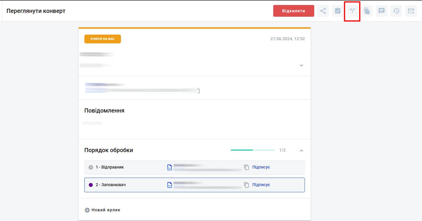 - Користувач, на якого делегували конверт зможе виконати всі дії, які були призначені для ролі ініціатора, або скасувати делегування