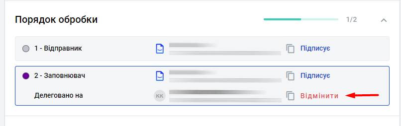 - Ініціатор може скасувати делегування, якщо користувач, на якого делегували конверт не завершив свій крок у процесі обробки конверта. У цьому випадку цей користувач втрачає доступ до конверта. Для цього ініціатор повинен натиснути кнопку "Скасувати" у вікні процесу обробки